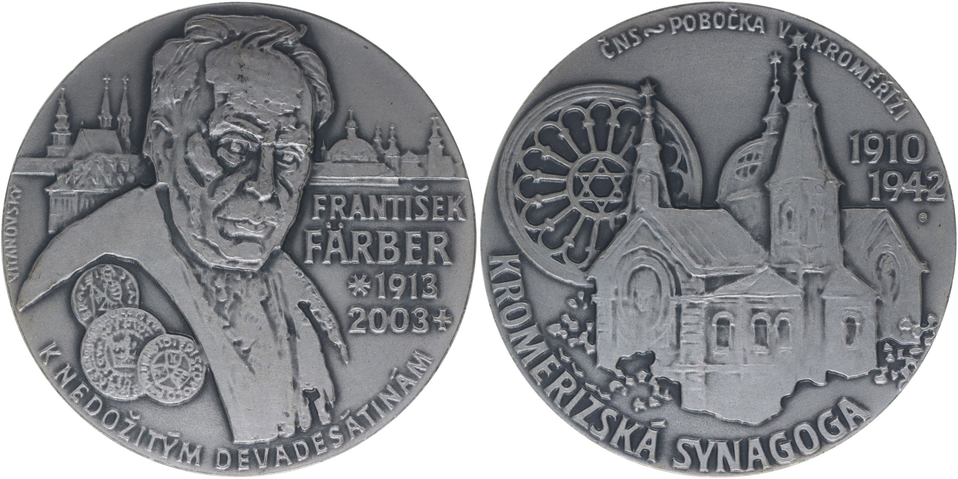 M.Vitanovský - František Färber k nedožitým devadesátinám 1913 - 2003 Kroměřížská synagoga 1910 - 1942, portrét čelně mírně zprava, 4řádk. nápis, opis / pohled na synagogu, opis, Sign., Punc.925, Ag 50 mm, 69.6 g, nákl.20 ks, číslov. na hr."6", MF.A18/19a_R!