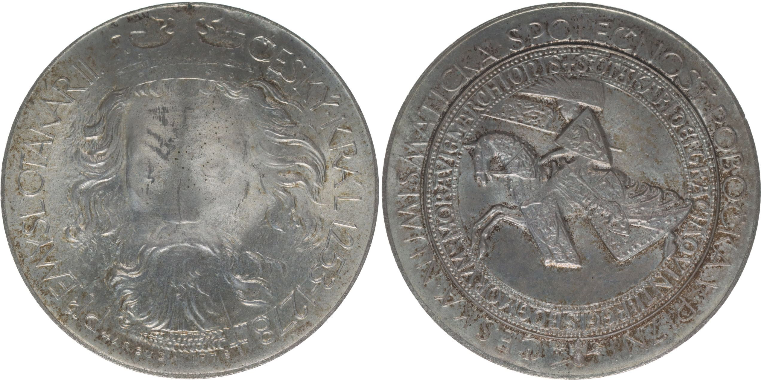 J.Harcuba - Přemysl Otakar II., 1253 - 1278, 1978 Korunovaná hlava zpředu, opis / replika pečeti ve dvojím opisu, Sign., Ag 750, 40 mm, 29.8 g, BK.32/6, MF.A28/6a