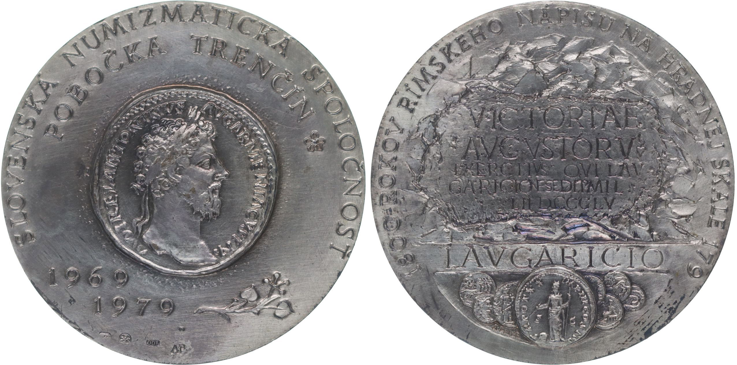 Laugarício Trenčín 179 - 1979 a 10 let pobočky 1969 - 1979#Ag Uprostřed antický denár, opis / 5řádk.lat.nápis, opis Sign.A.P., Punc., Ag 40 mm, 34.05 g, PF.TN01
