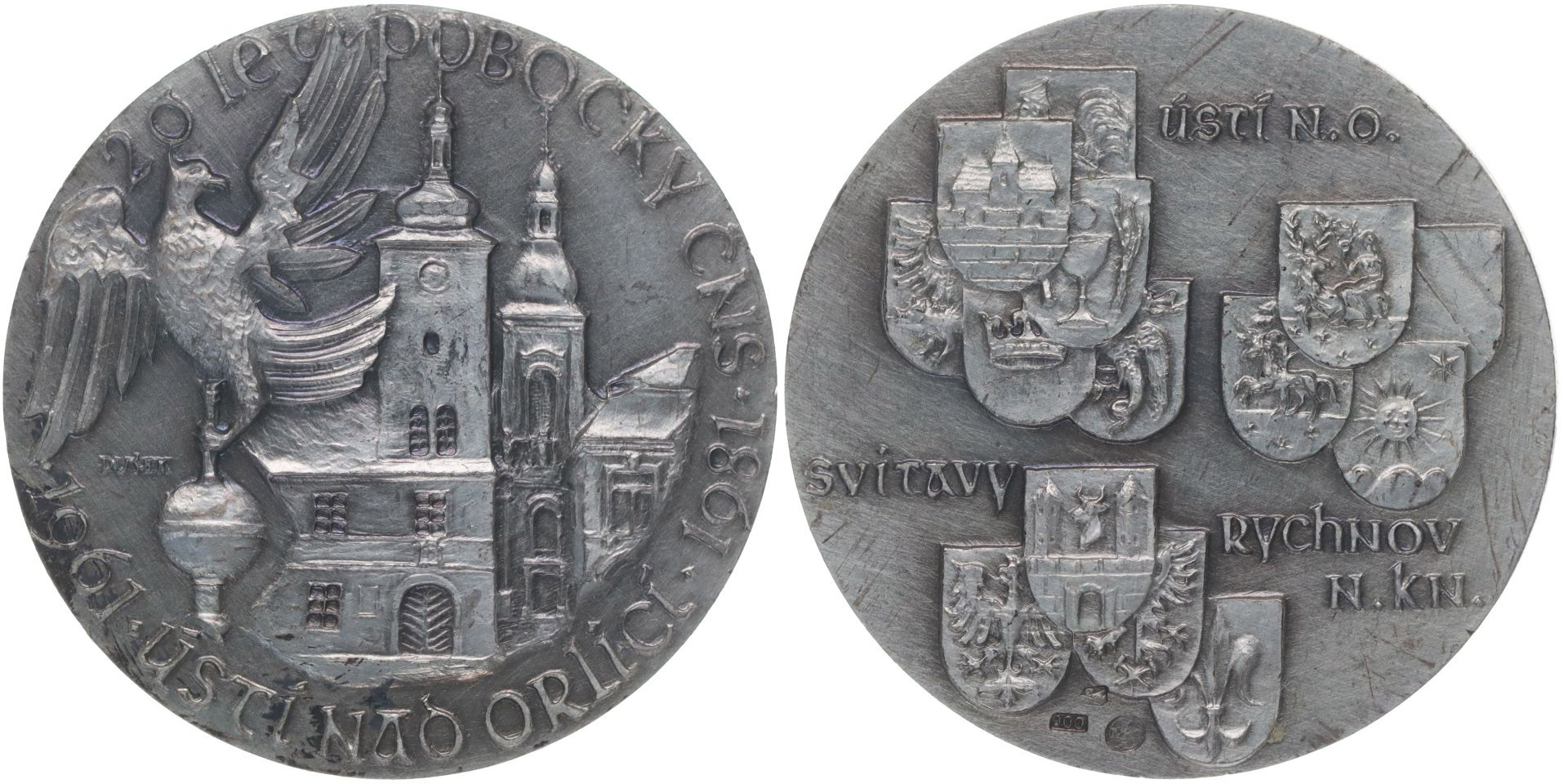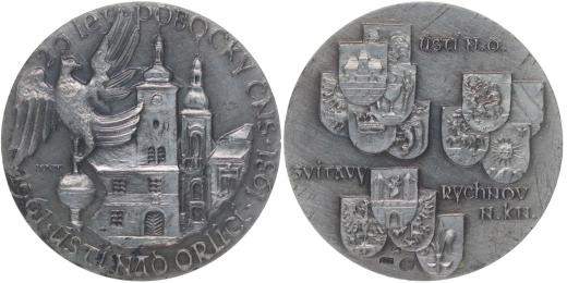 T.R.Dušek - 20 let pobočky, 1961 - 1981#Ag Histor.budovy, orlice, opis / znaky Ústí n.O., Rychnova n.Kněžnou a Svitav, nápisy, Sign., Ag 900/1000, 30 mm, 16,8 g, BK.43/4, MF.A41/3a