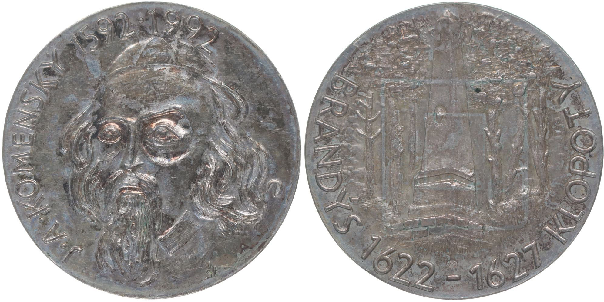 T.R.Dušek - Jan Amos Komenský - 1592 - 1992 Portrét čelně mírně zleva, opis / pomník J.A.Komenského v Brandýse, opis, Sign., Ag 900/1000, 31 mm, 9,9 g, MF.A41/11a, náklad 10 ks_R!