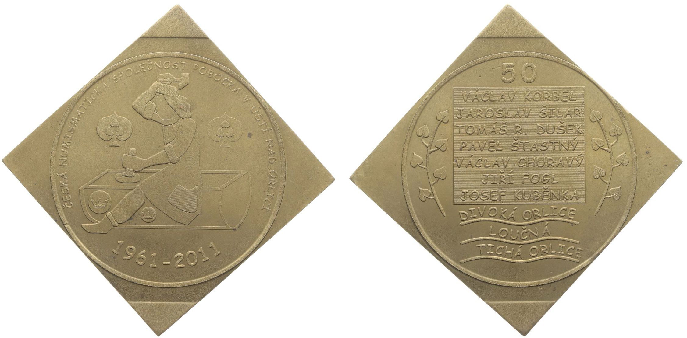 V.Mareš - medaile k 50.výročí pobočky 1961 - 2011 Sedící pregéř zleva, opis / ve čtverci jména předsedů pobočky Sign., Mosaz.klipa 51 mm, 125,85 g, jako MF.A41/14b, ale klipu neuvádí _RR!