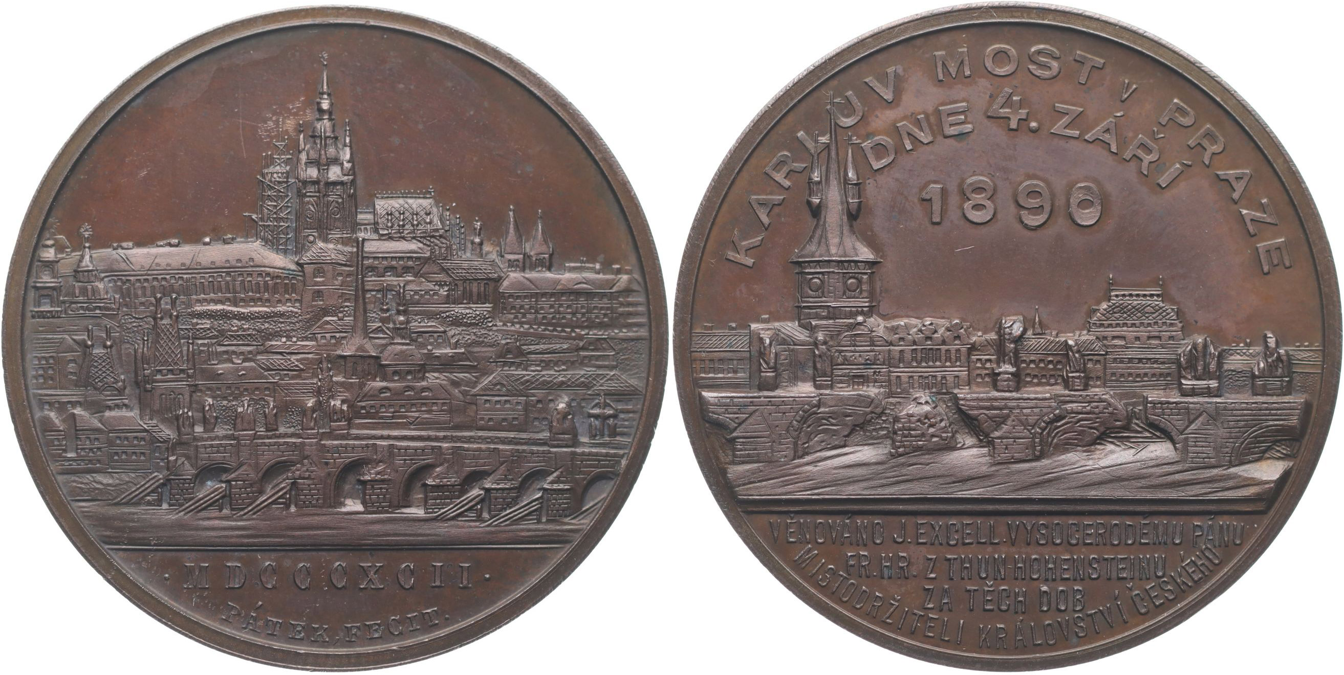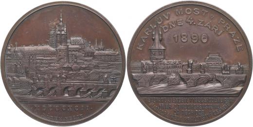 Medaile na památku protržení a obnovu Karlova mostu#Bronz Pohled na protržený most, opis, nápis, dat.4.IX.1890 / obnovený most a letopočet 1892, Sign., Bronz 41 mm, MZČ.180/6