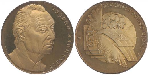 Alexander Dubček - Já verím v dobro človeka, 1993 Hlava mírně zprava, opis / na glóbu slovenská vlajka a ratolest Sign., Punc.900, Pozlac.Ag 40 mm, 39 g, čísl. na hr.2_certifkát