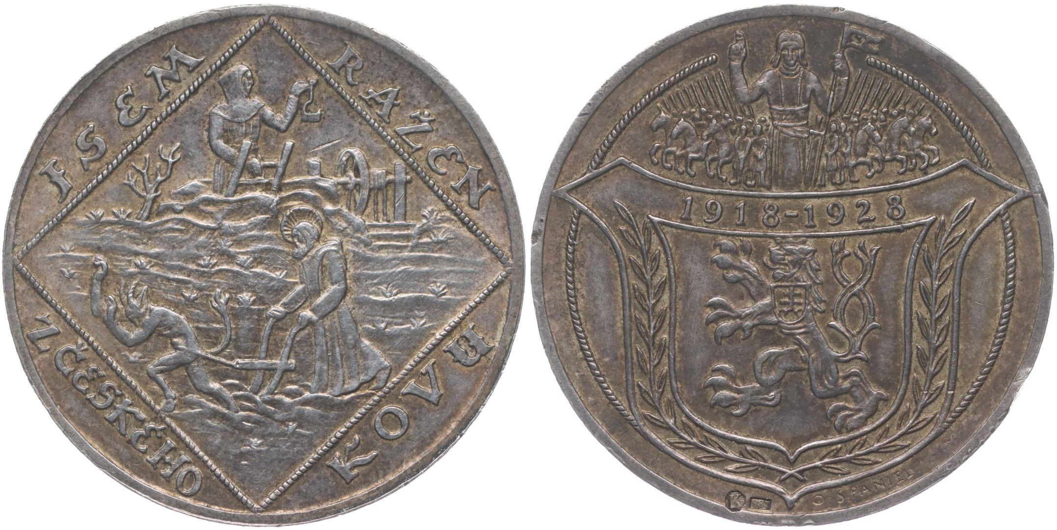 Jsem ražen z českého kovu - 10. výročí republiky 1928#Ag Sv.Prokop orá s čertem, havíř, opis / státní znak, Sv.Václav s rytíři, Sign., Punc.987, Ag 34 mm, 20.1 g_dr.hry v rev.