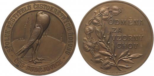 Karnet-Kyselý Praha - Spolek chovatelů čistokrevných holubů, b.l. Stojící holub, v pozadí město, opis / 4řádk.nápis Odměna za vzorný chov, Sign., Bronz 44 mm, 33 g