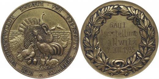 Za pěstitelské zásluhy - německá sekce, župní výstava 7.XII.1935 Domácí zvířata u zdi, něm.opis / 4řádk.vyrytý nápis ve věnci Nesign., Pozlac.bronz 50 mm, 54 g