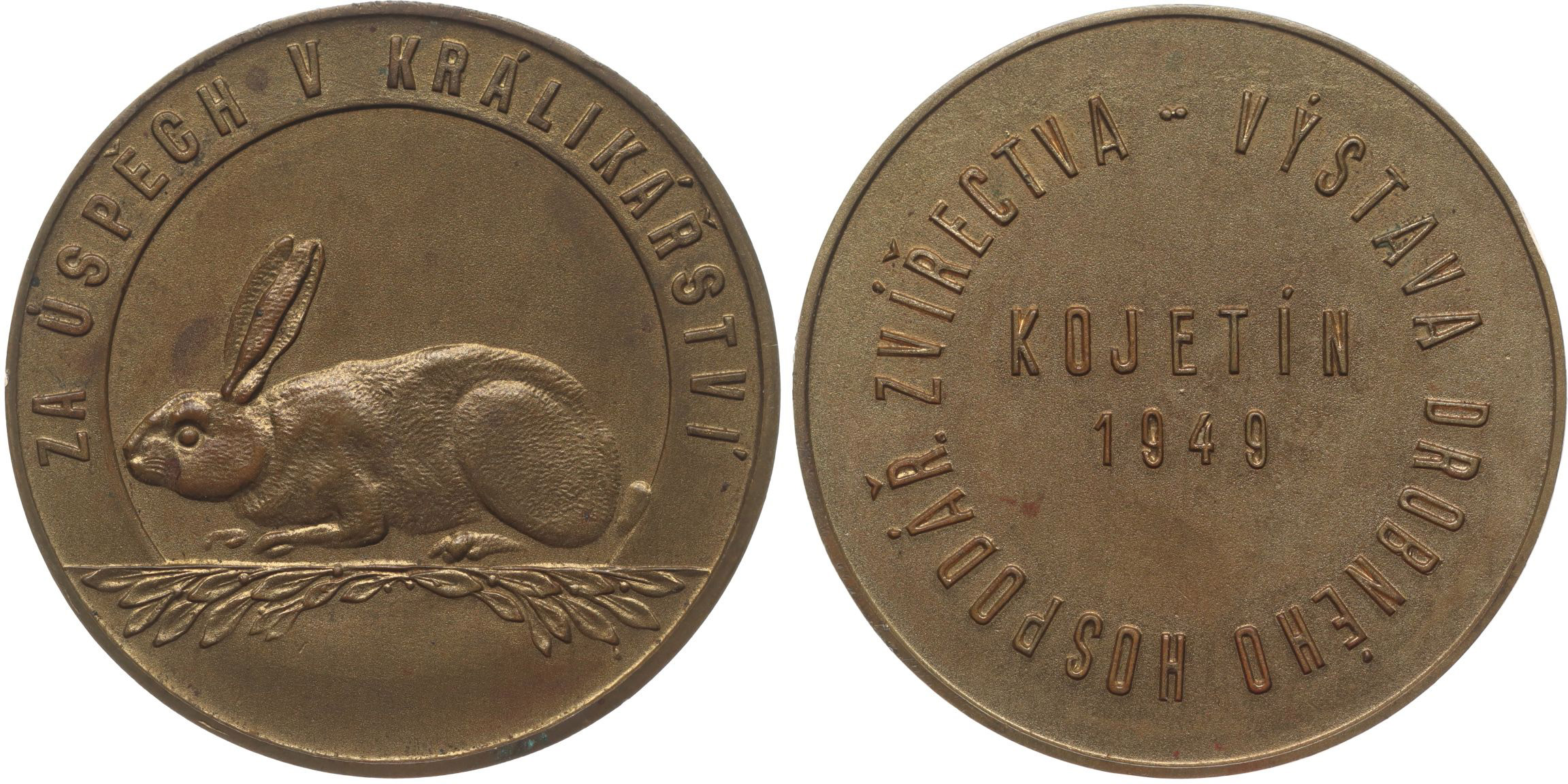Nesign. - výstava drobného zvířectva 1949 - Za úspěch v Králíkářství Sedící králík, opis / 2řádk.nápis, opis, Pozlac.bronz 35 mm, 14 g_R!