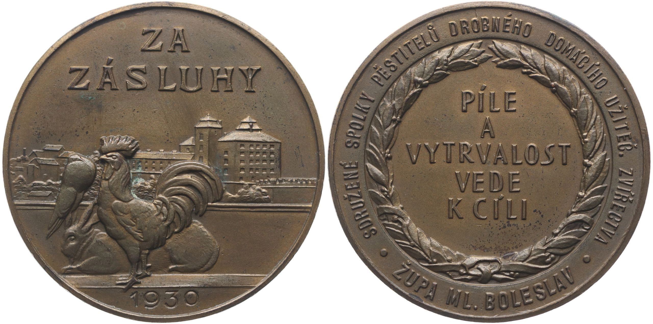 Nesign. - sdružené spolky pěstitelů drobného domácího užiteč. zvířectva - župa Ml.Boleslav - Píle a vytrvalost vede k cíli - Za zásluhy 1930, 5řádk.nápis ve věnci, opis / 2řádk.nápis, v pozadí pohled na město, vročení v úseči, Bronz 40 mm, 20 g