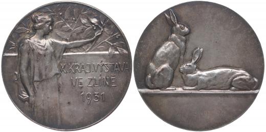 Nesign. - X.kraj. výstava ve Zlíně 1931 Stojící ženská alegorická postava zprava, 3řádk.nápis / dva králíci, Postř.bronz 40 mm, 19 g