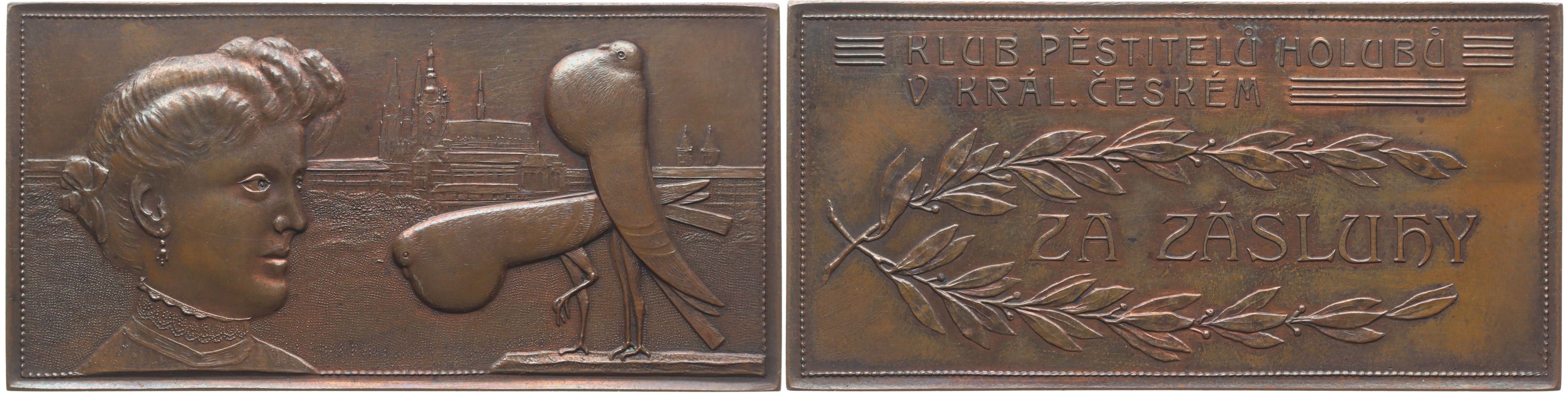 Nesign. - klub pěstitelů holubů v Král. českém - Za zásluhy, b.l. Ženská hlava se dvěma holuby, v pozadí panorama Hradčan / 3řádk. nápis ve věnci, Bronz.plaketa 35x68 mm, 30 g_R!