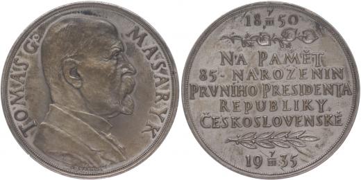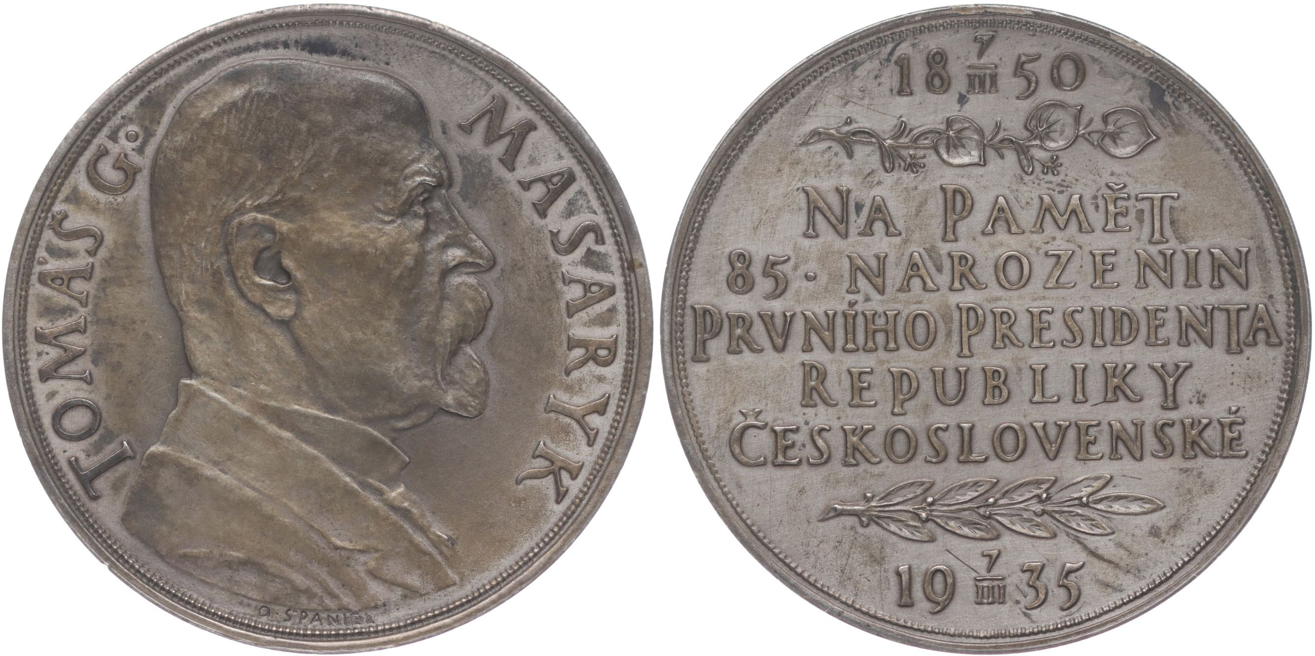 O.Španiel - na 85.narozeniny, 1935 (Ag matové 42 mm) Poprsí zprava, opis / sedmiřádkový nápis, lipová a vavřínová snítka, Fl.42c, Nov.01.099b
