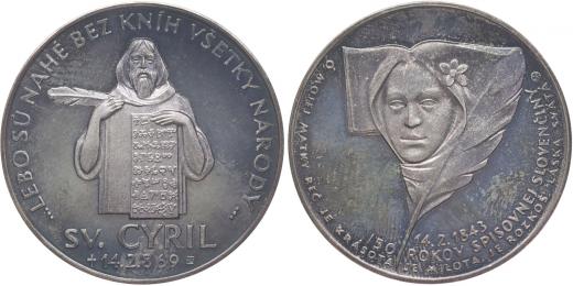 Nesign. - 150 let spisovnej slovenčiny, 1843 - 1993 Hlava ženy na knize, trojitý opis / polopostava sv.Cyrila, nápis, opis Punc.900, Ag 40 mm, 38,08 g