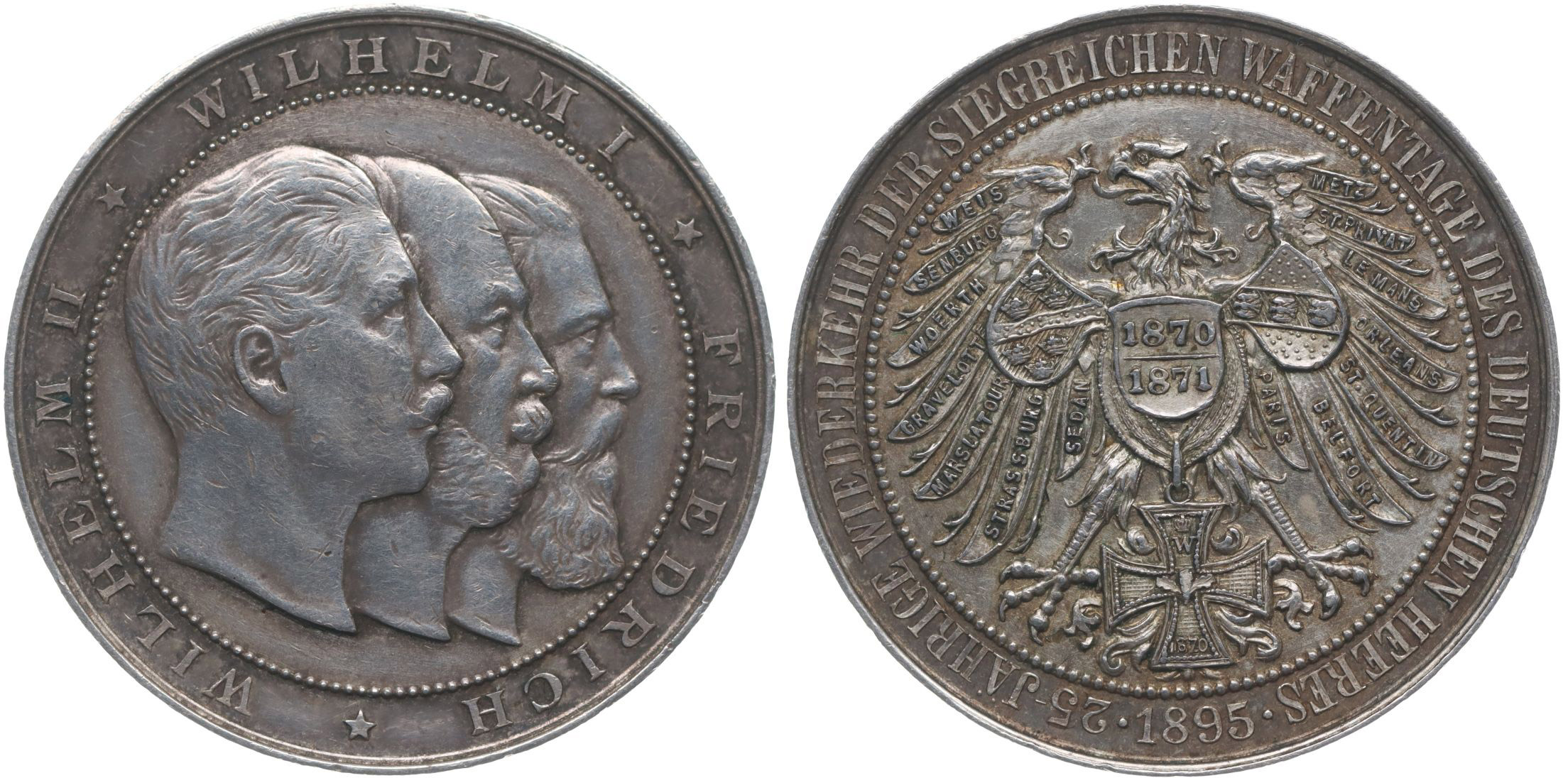 Vilém II. - medaile k 25.výr. vítězství nad Francií, 1870-1871-1895 Trojpoprtrét císařů Viléma I., Friedricha a Viléma II., opis / říšská orlice s vročením v prsním štítku, v perutích jména vítězných měst, opis, Ag 34 mm, 19,38 g, nápis na hraně JUBILAEUM SEGENSMÜNZ
