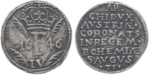 Ferdinand IV. - malý korunovační peníz 1646, Praha 19 mm, 1,73 g, Nech.88