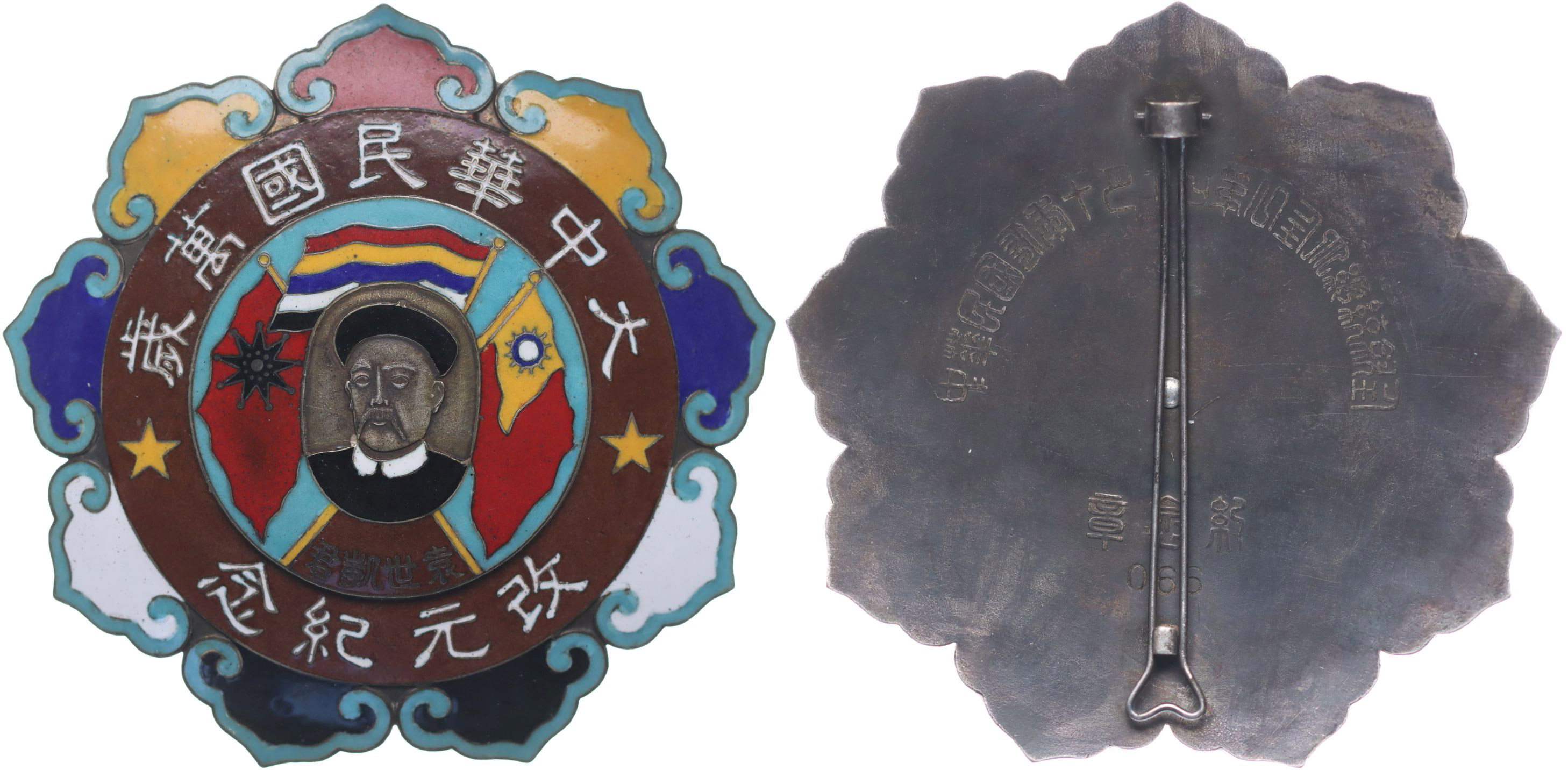 Pamětní plaketa k vyhlášení Čínské republiky (po r.1912) Smaltov.plaketa 90x90 mm, v rev.číslo 066 a znaky_se sponou