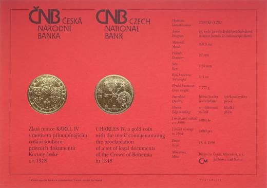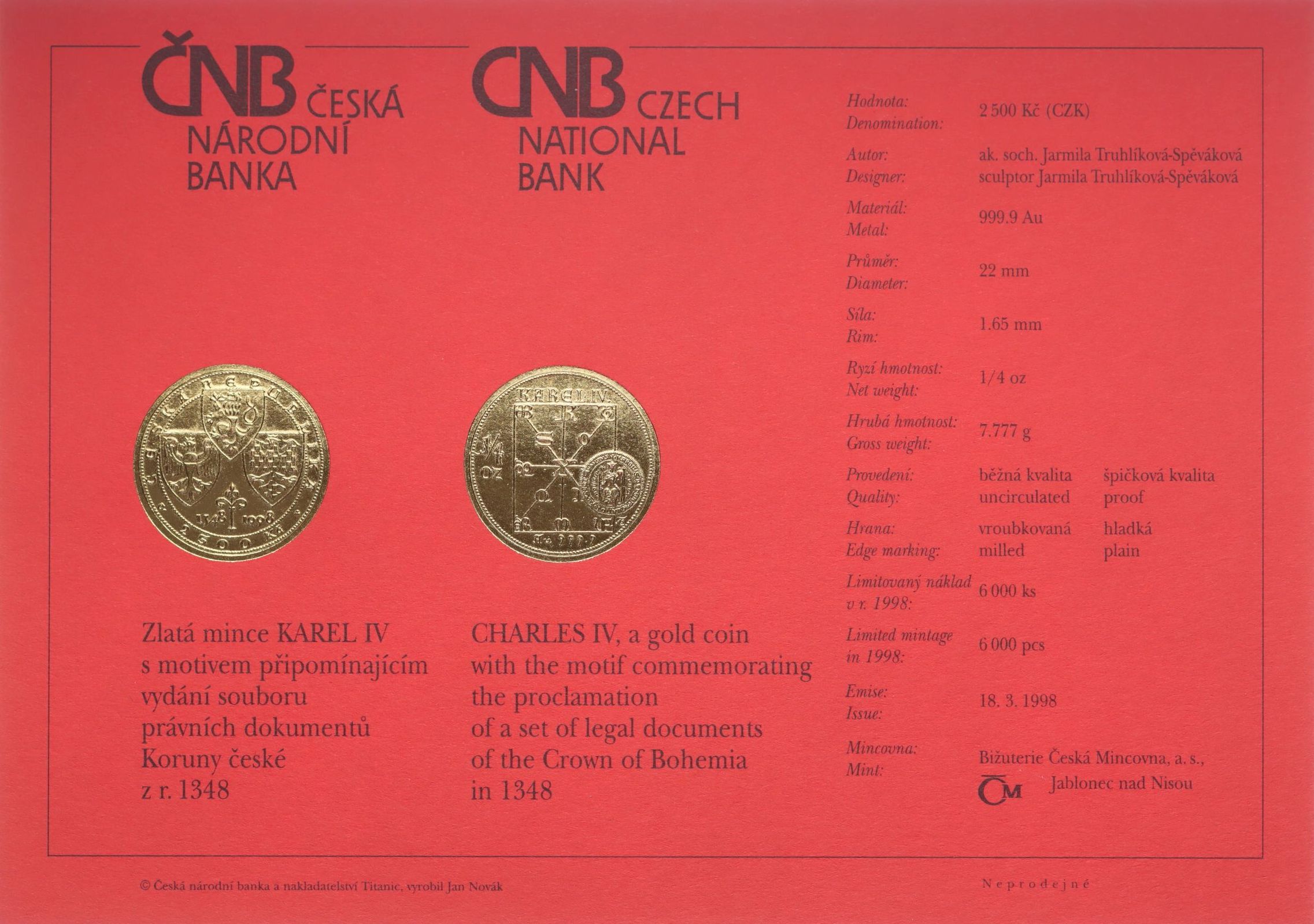Karta (certifikát) pro minci 2500 Kč 1998 - Karel IV.