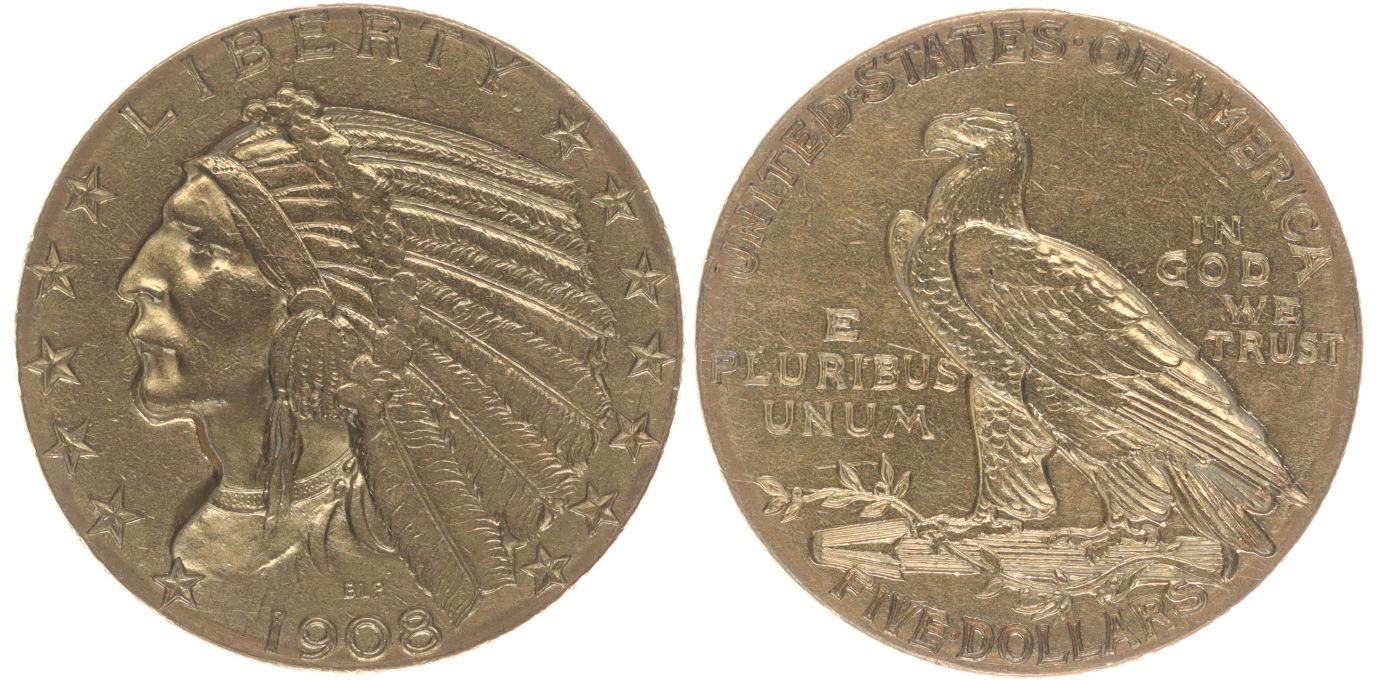 5 Dolar 1908 - hlava indiána, Y.57, 8.158 g