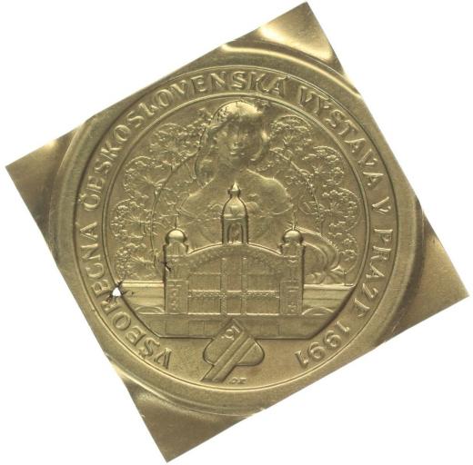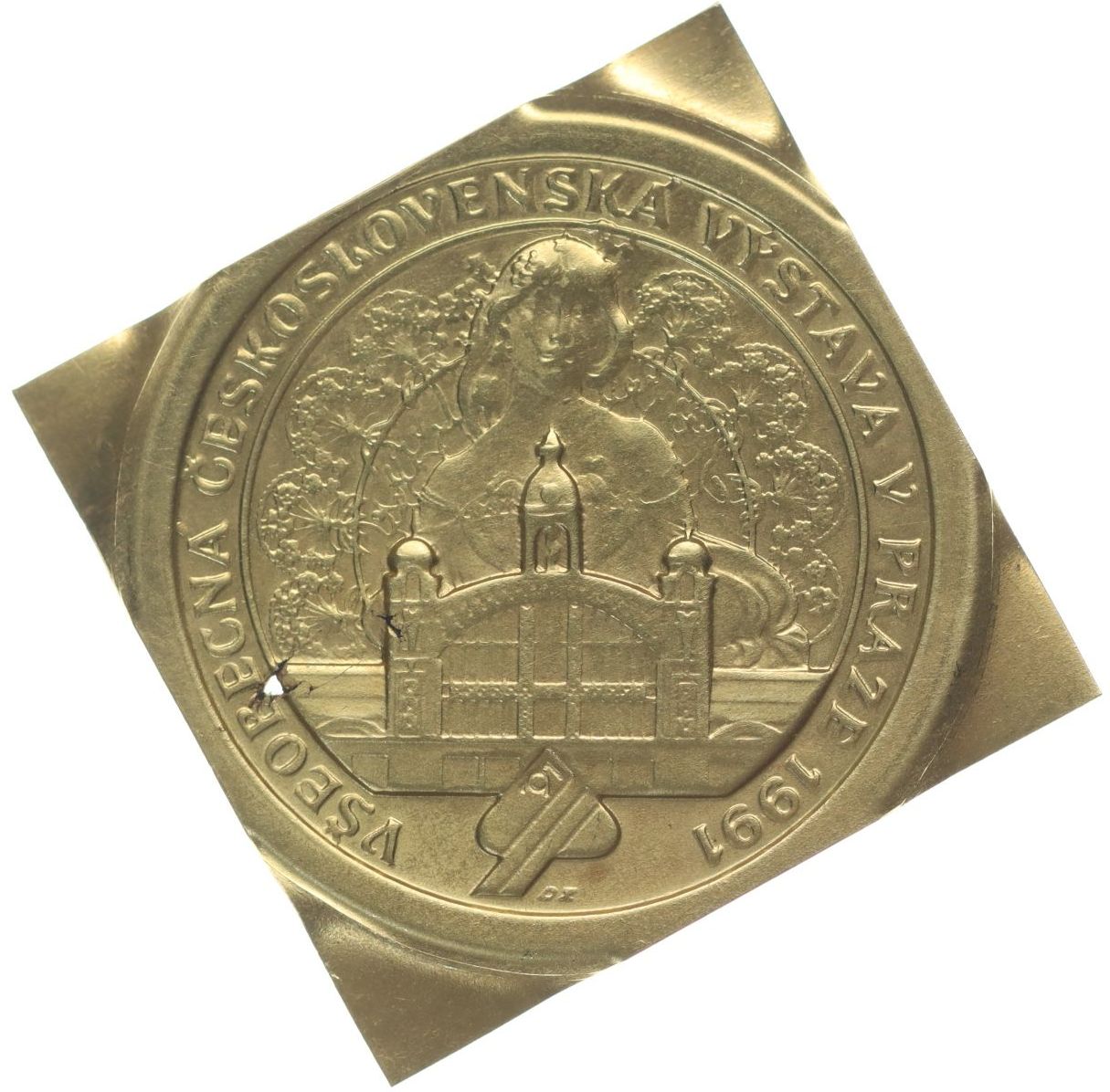 Všeobecná československá výstava 1991 Průmyslový palác, v pozadí dívka, krajkový motiv, opis Sign.OZ, Au dutá klipa 29x29 mm, 4,15 g, nepunc. (ryz.900 - přiložen doklad punc.úřadu)_dr.perf.raž.
