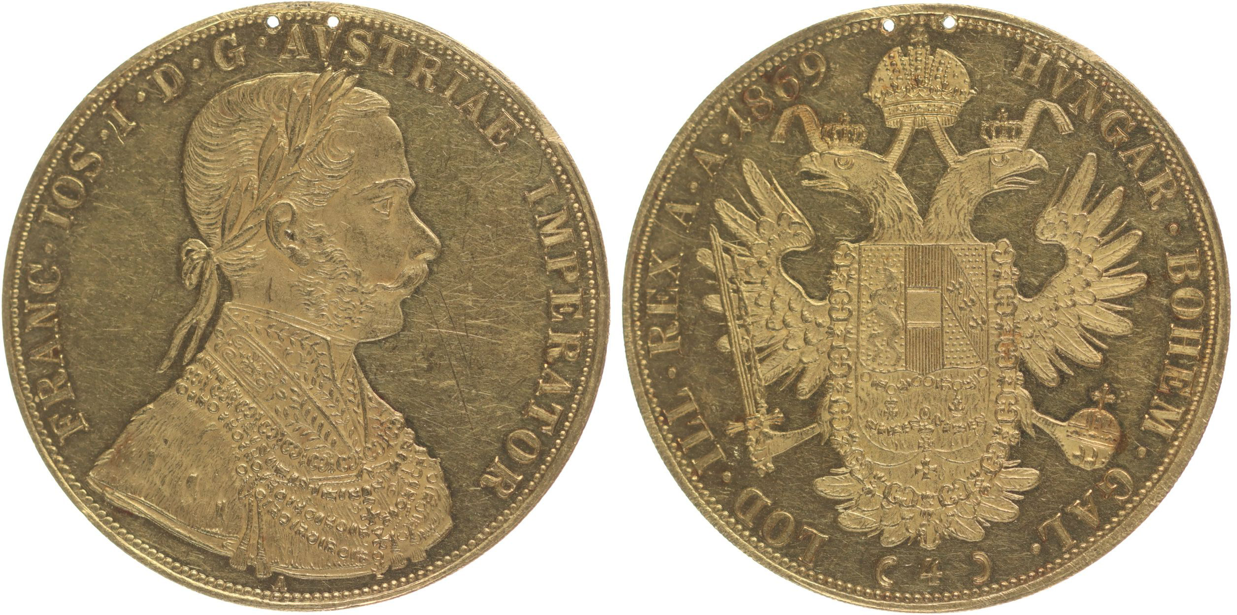 4 Dukát 1869 A (raženo pouze 18.740 ks) _dvě dírky po korunce, vl.rysky v av. R!