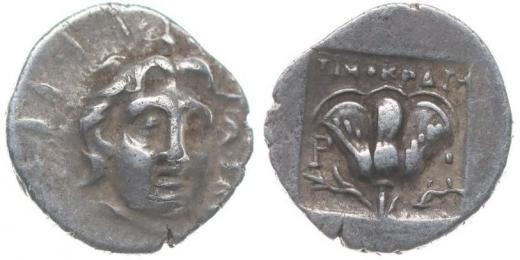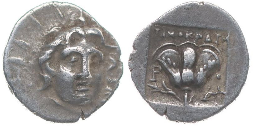AR Hemidrachma, hlava čelně mírně zprava / květ růže a monogram v inkusním čtverci, 1.31, SG.5065