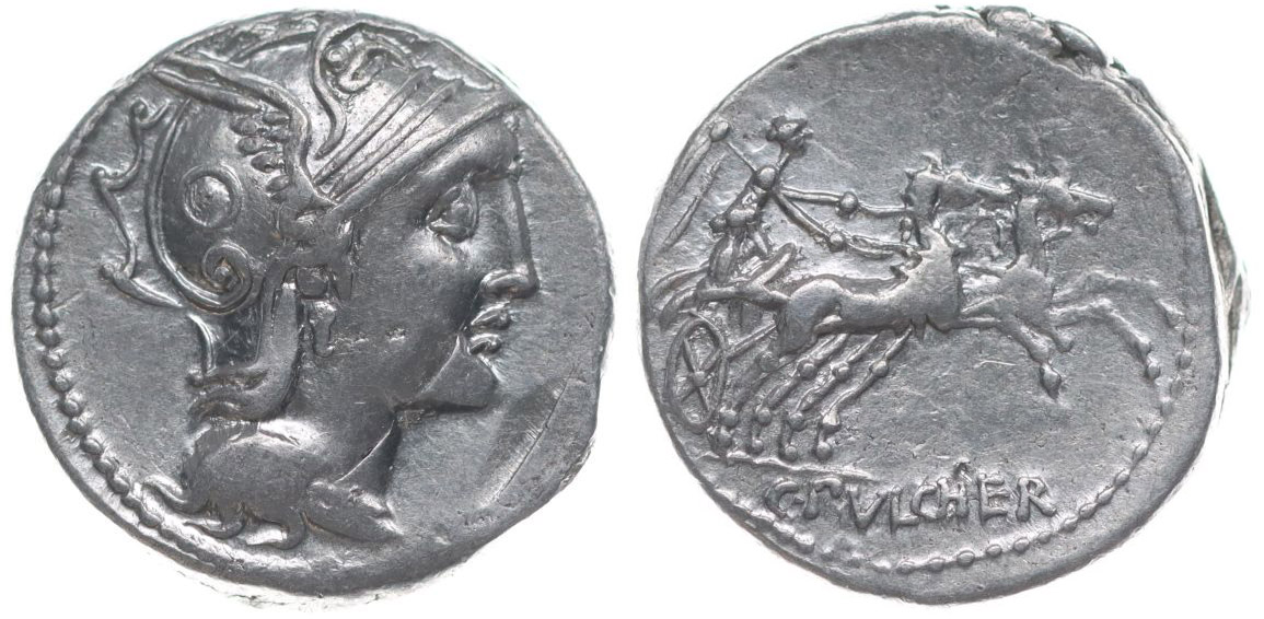 AR Denár, Hlava Romy zprava / Viktorie v bize zprava, nápis "C.PVLCHER.", Crawford.300/1, Al.1091, Ves.1099