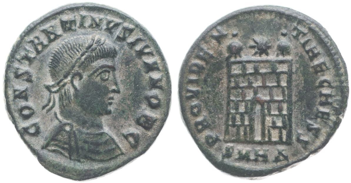 AE3, "PROVIDENTIAE CAESS", táborová brána se dvěma věžemi S.3848, C.164, K.145.40pod., RIC.88