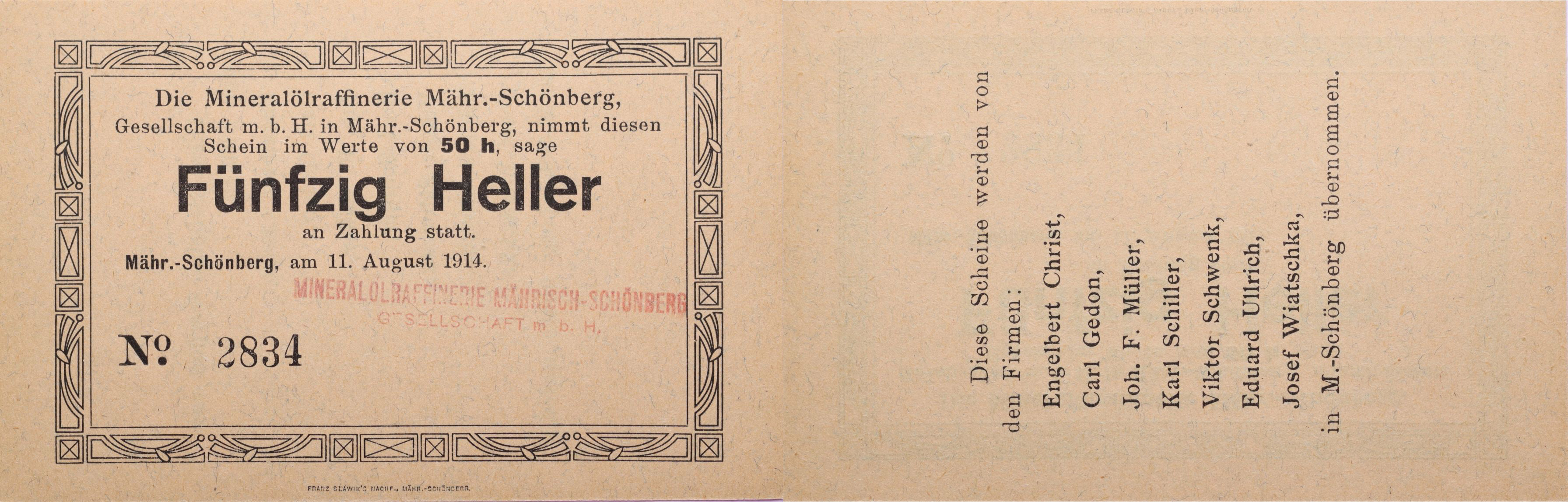 Šumperk (M.Schönberg) mineral.raf., 50 Heller 11.8.1914, č.2834 s razítkem, bez podpisu, DH.120.2.1a.b