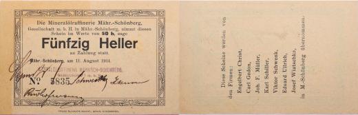 Šumperk (M.Schönberg) mineral.raf., 50 Heller 11.8.1914, č.5835 s razítkem a podpisy, DH.120.2.1a.očást.zahnědlý papír