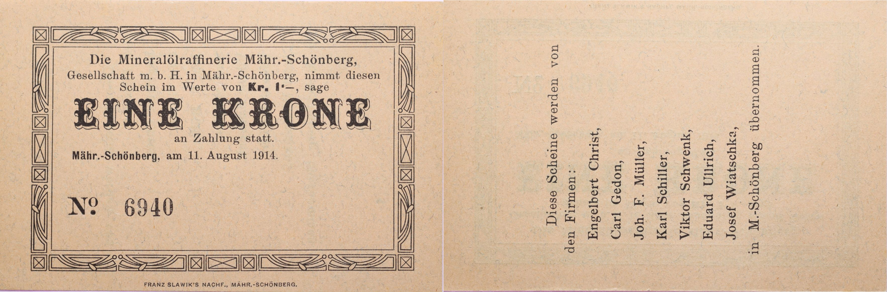 Šumperk (M.Schönberg), mineral.raf., 1 Krone 11.8.1914, č.6940, DH.120.2.2.t, bez razítka, bez podpisu