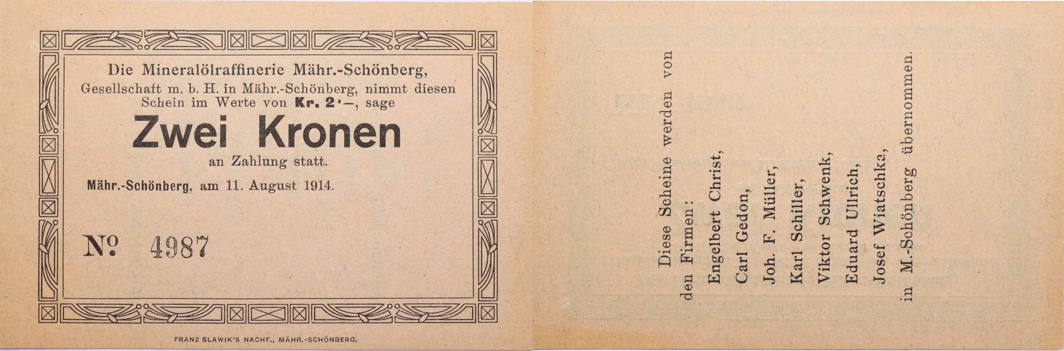 Šumperk (M.Schönberg), mineral.raf., 2 Krone 11.8.1914, No.4987, DH.120.2.3.t, bez razítka, bez podpisu