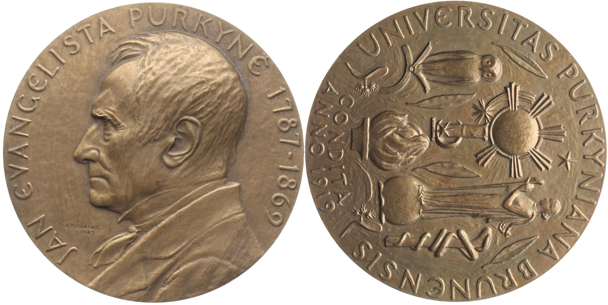 Jan Evangelista Purkyně 1787 - 1869 - Purkyňova universita 1919 Poprsí zleva, opis / stylizované prvky fakult, opis, Sign., Bronz kostí, letopočet, Sign.V.A.Kovanič 1987, Bronz 80 mm