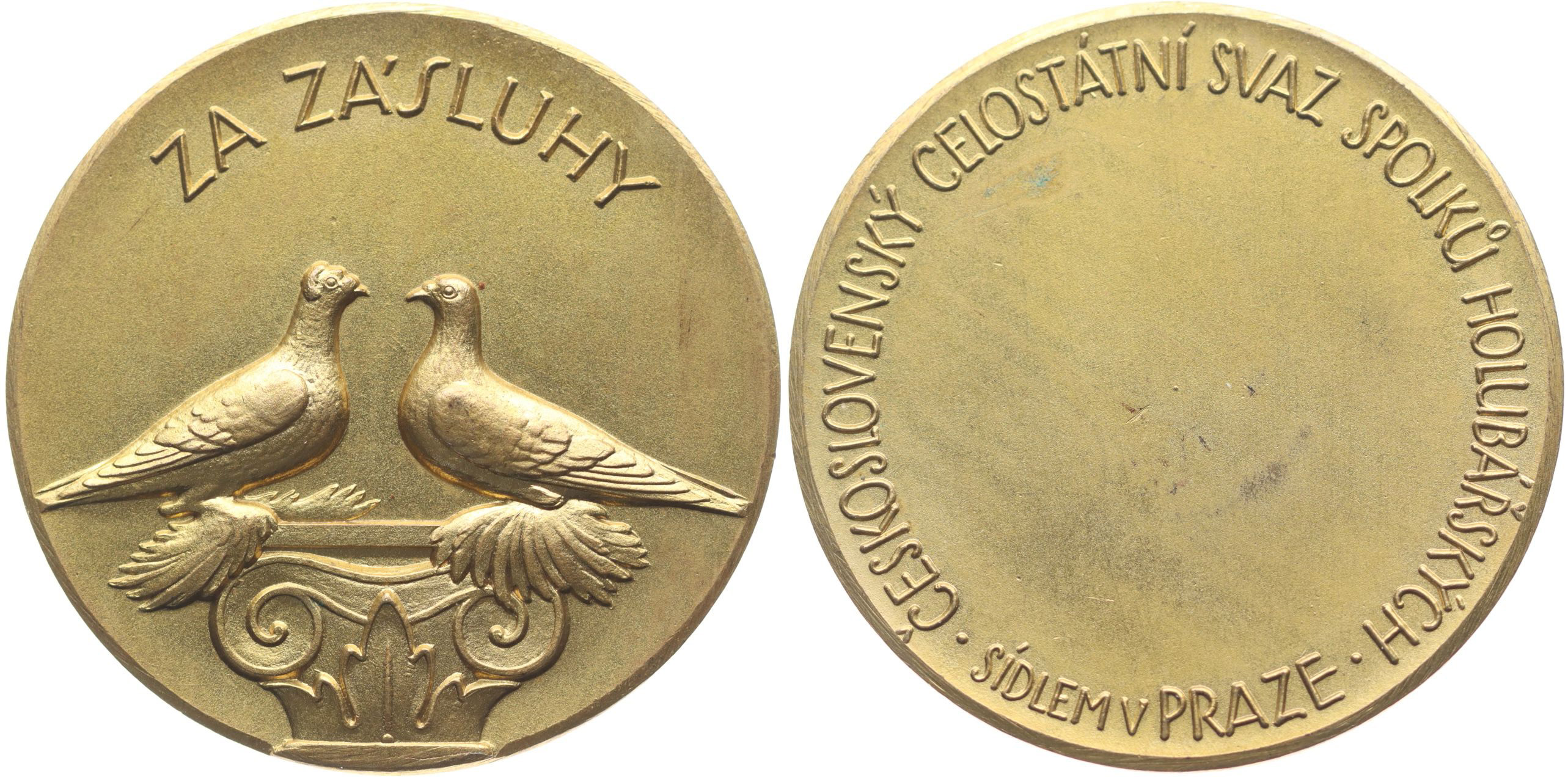 Nesign. - Československý celostátní svaz spolků holubářských sídlem v Praze, b.l. - Za zásluhy, dva holubi na sloupu proti sobě / opis, Pozlac.bronz 40 mm, 23 g
