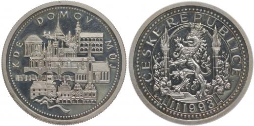 Nesign. - Kde domov můj - České republice, 1.1.1993 Pohled na dominanty Prahy, opis / korunov.český lev, opis Punc.999, Ag 35 mm, 15.00 g_orig.etue