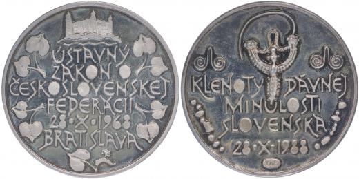 Bratislava - ústavný zákon československej federácii 28.X.1968 - výstava Klenoty dávnej minulosti Slovenska 28.X.1989 s vystavenými předměty, Postř.medaile 60,5 mm, 101,93 g _orig.etue s udělením Milošovi Jakešovi 24.10.1988