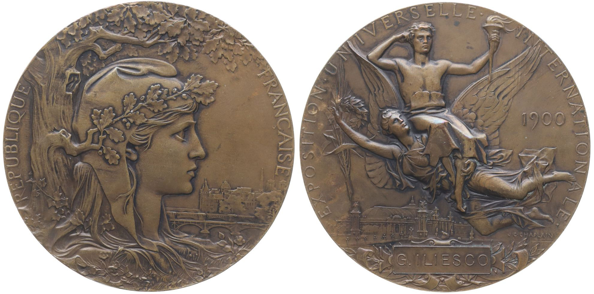 J.C.Chaplain - všeobecná mezinární výstava 1900 Pod stromem hlava Marianny zprava / dvě vznášející se alegorické postavy, opis, Sign., Bronz 64 mm