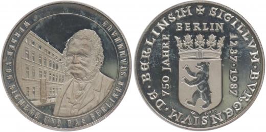 Nesign. - medaile k 750.výr.Berlína 1237 - 1987 Poprsí Wernera v.Siemens a budovy Stammhaus, opis / korunovaný znak mětsa, vročení, opis, Punc.900, Ag 40 mm, 20,1 g