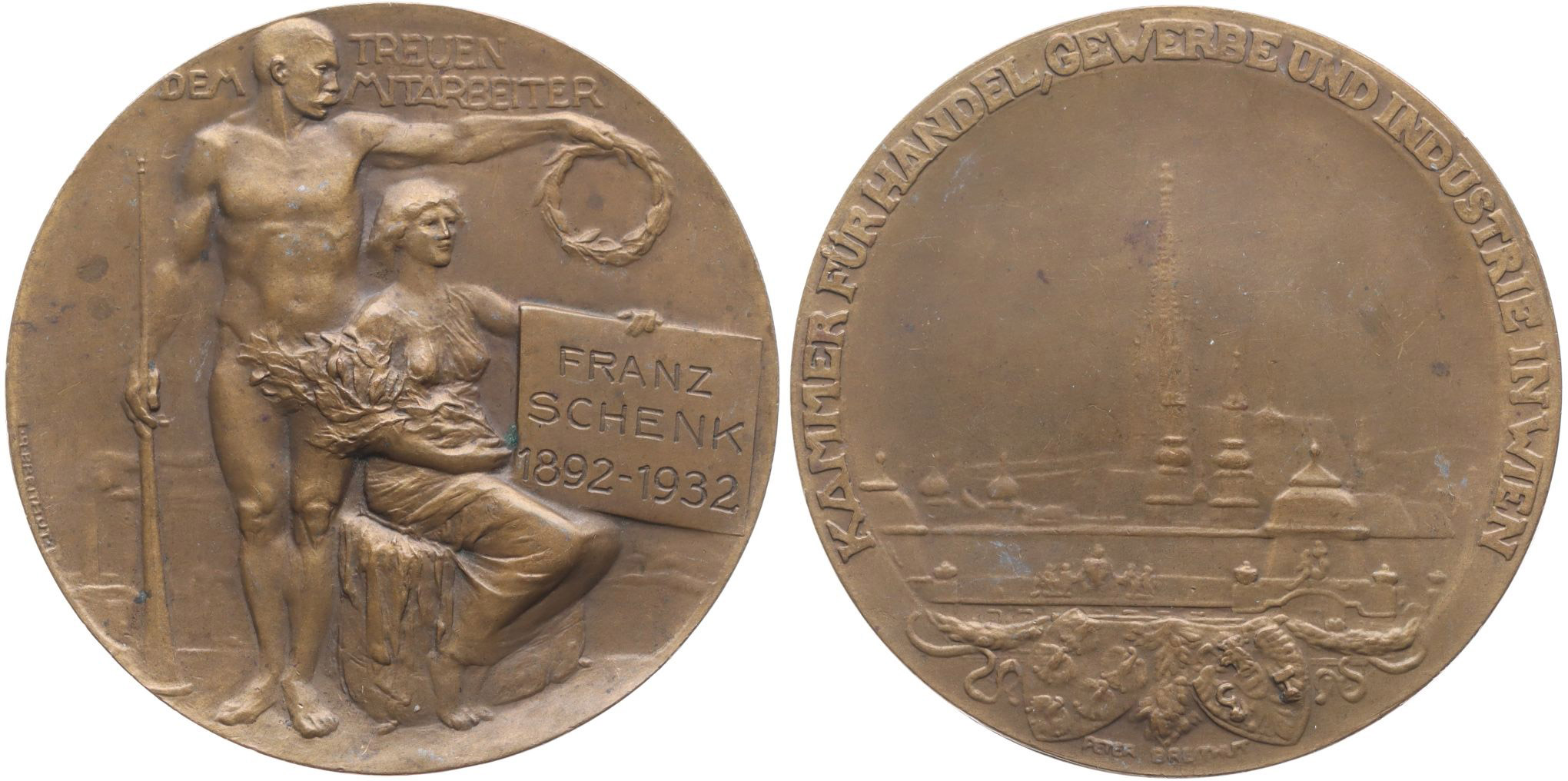 Vídeň - obchodní živnostenská a průmyslová komora ve Vídni 1932 Stojící mužská a sedící ženská postava s nápisem Franz Schenk 1892 - 1932 / pohled na panorama města, opis, Sign.P.Breithut, Bronz 66 mm