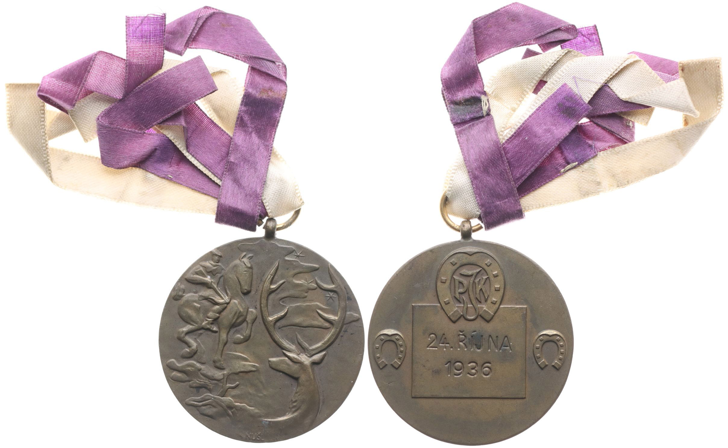 ČSR - Hubetova jezdecká slavnost - "PJK" v podkově, 24.října 1936 Jzdec s puškou na koni, hlava jelena / podkova, vročení v rámečku Sign.Nušl, Bronz 44 mm_orig.ouško se stuhou