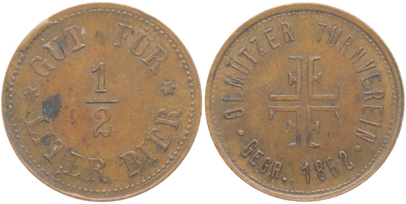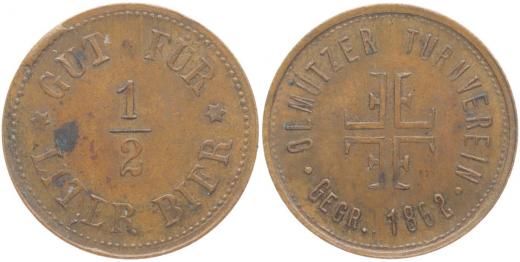Olomouc (Olmütz) - olomoucký tělocvičný spolek - založen 1862 - známka na 1/2 L piva, "1/2", opis / turnerský znak, opis Cu 21 mm, 2,90 g