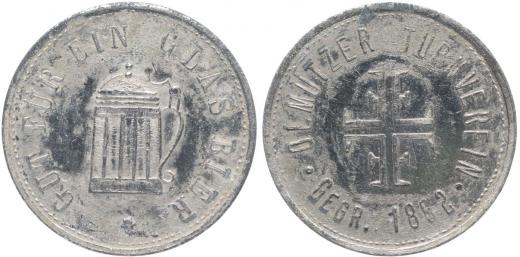 Olomouc (Olmütz) - olomoucký tělocvičný spolek - založen 1862 - známka na 1 sklenici piva, korbel, opis / turnerský znak, opis Ponikl.Zn 21,7 mm