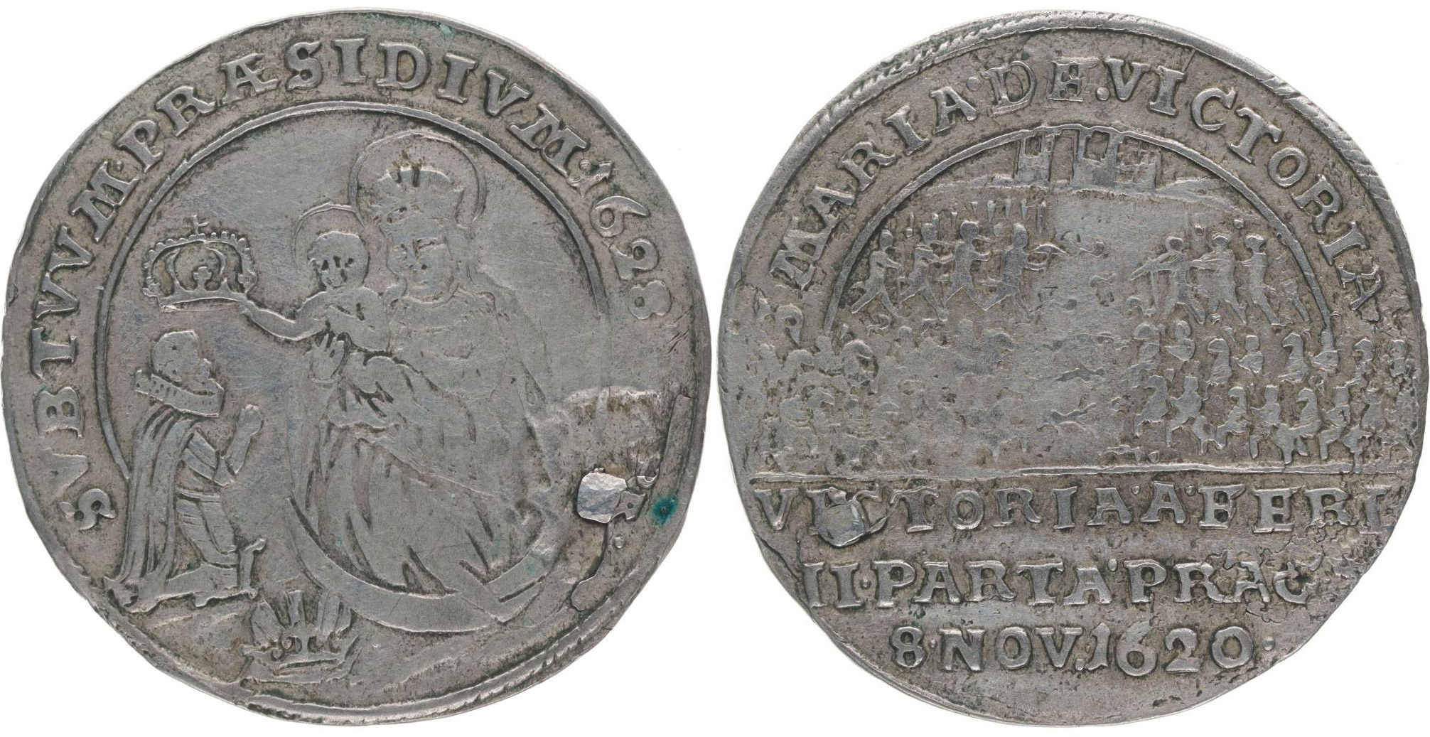 1/4 Tolar na vysvěcení kaple na Bílé Hoře, 25.IV.1628 Výjev z bitvy, opis a nápis / Madona korunuje klečícího krále, opis, Ag 32 mm, 4,5 g, Mo.761_zaletov.dírka