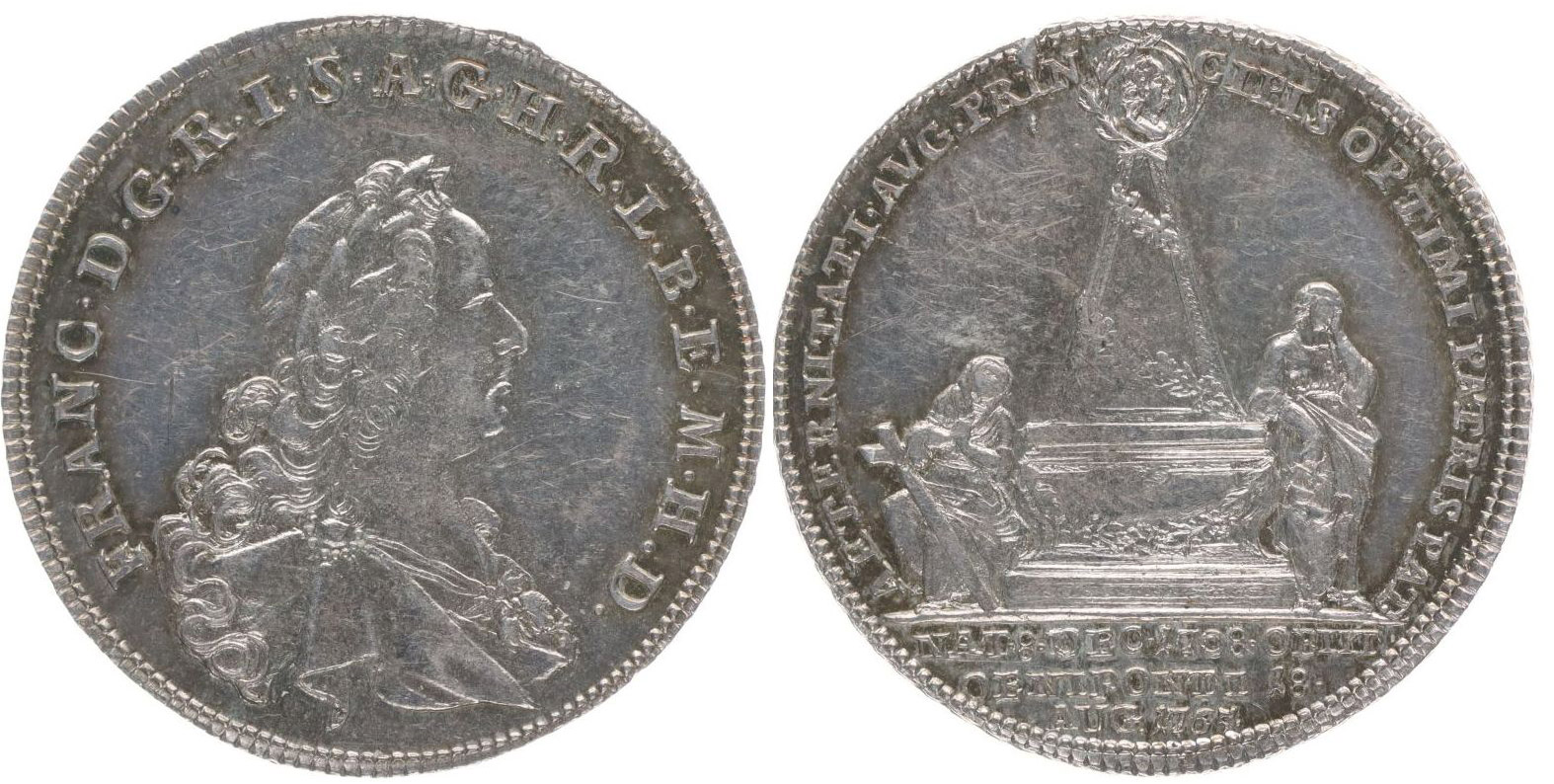 Větší úmrtní peníz, 1765 Poprsí zprava, opis / žena klečící před náhrobkem, postava Spravedlnosti, 3řádk.nápis v úseči, opis, Ag 24 mm, 3,82 g, Mo.1950_R!