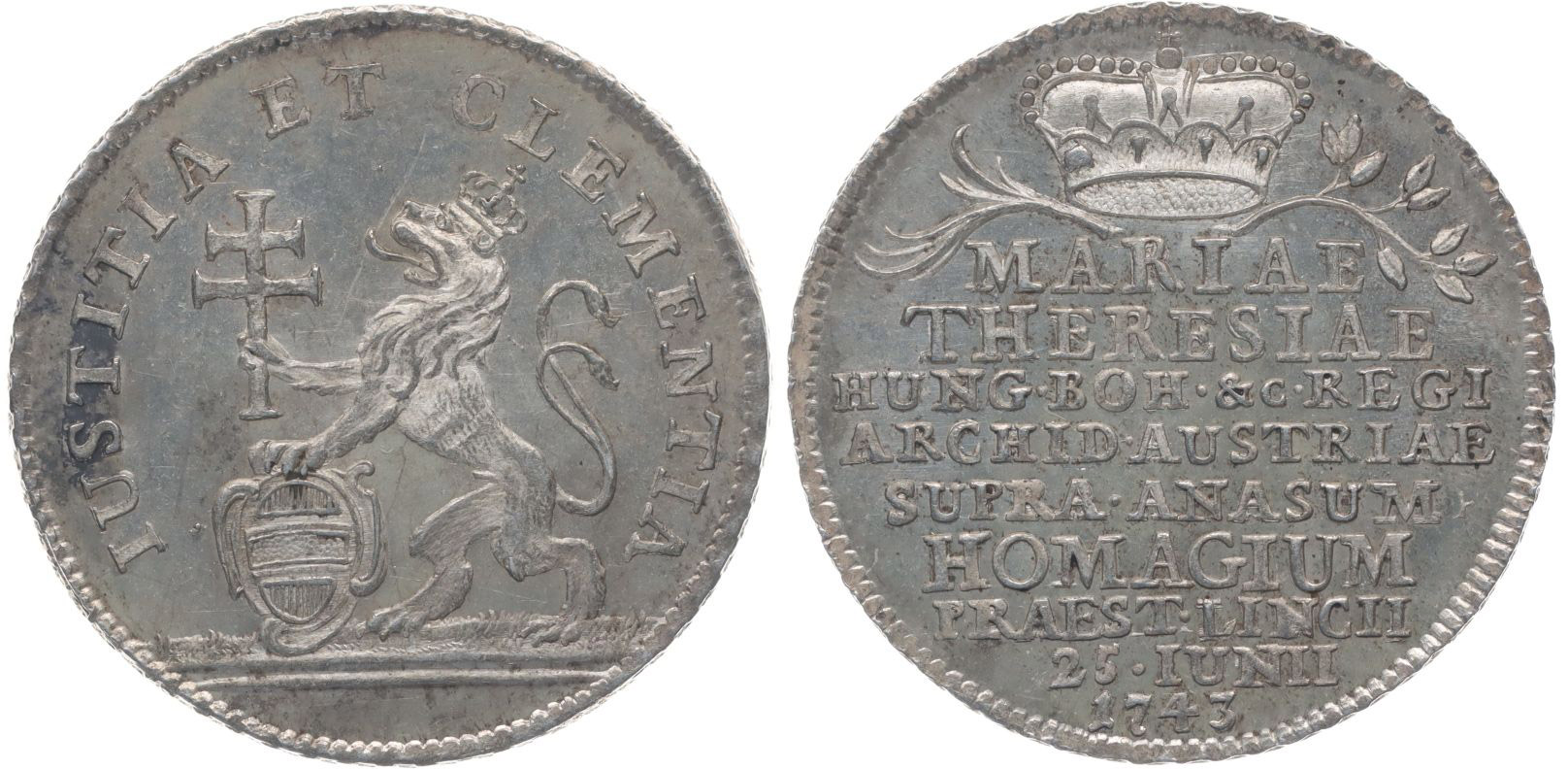 Větší peníz na holdování hornorakouských stavů v Linci, 25.6.1743 Pod korunou snítky a 9řádk.nápis / stojící lev, znak a kříž, opis Ag 25 mm, 4.10 g, Nov.XIII/H-1b, Mo.1729, LG.XIV/48