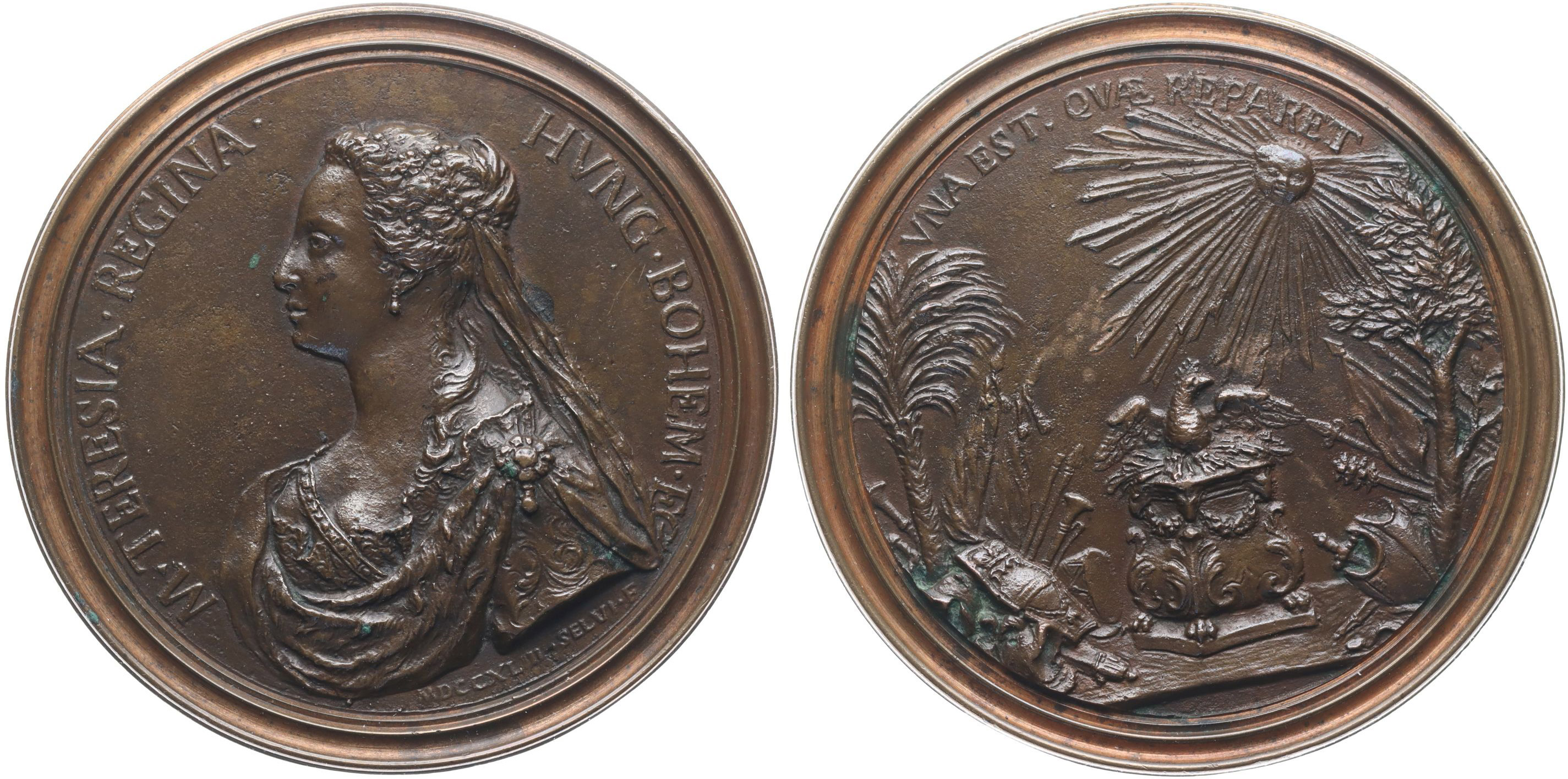 Selvi - medaile na korunovaci na českou královnu 12.5.1743 Poprí Marie Terezie se závojem zleva, dole vročení a signatura, opis / na oltáři orel s roztaženými křídly, vlevo palma, vpravo vavřín s trofejemi, nahože zářící slunce, opis, Bronz (litý) 86 mm, 138,90 g Nov.XIII/G-15b, SH.1374, We.7860_RR!