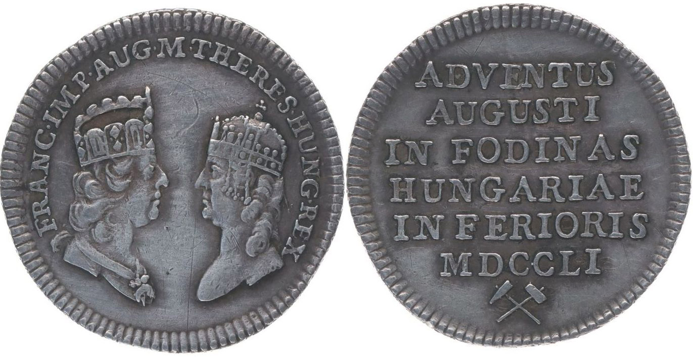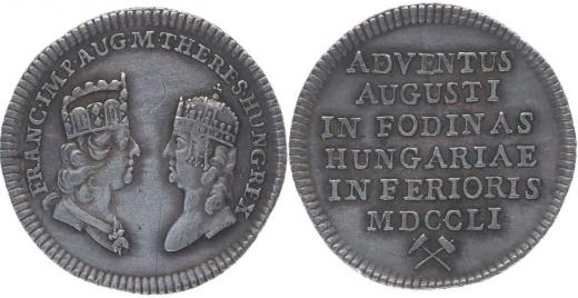 Malý žeton na návštěvu císař. páru v uherských horních městech#Ag Dvojportrét proti sobě, opis / 6řádk.nápis, kladívka Ag 21,5 mm, 2,21 g, Ho.2904, Mo.1830