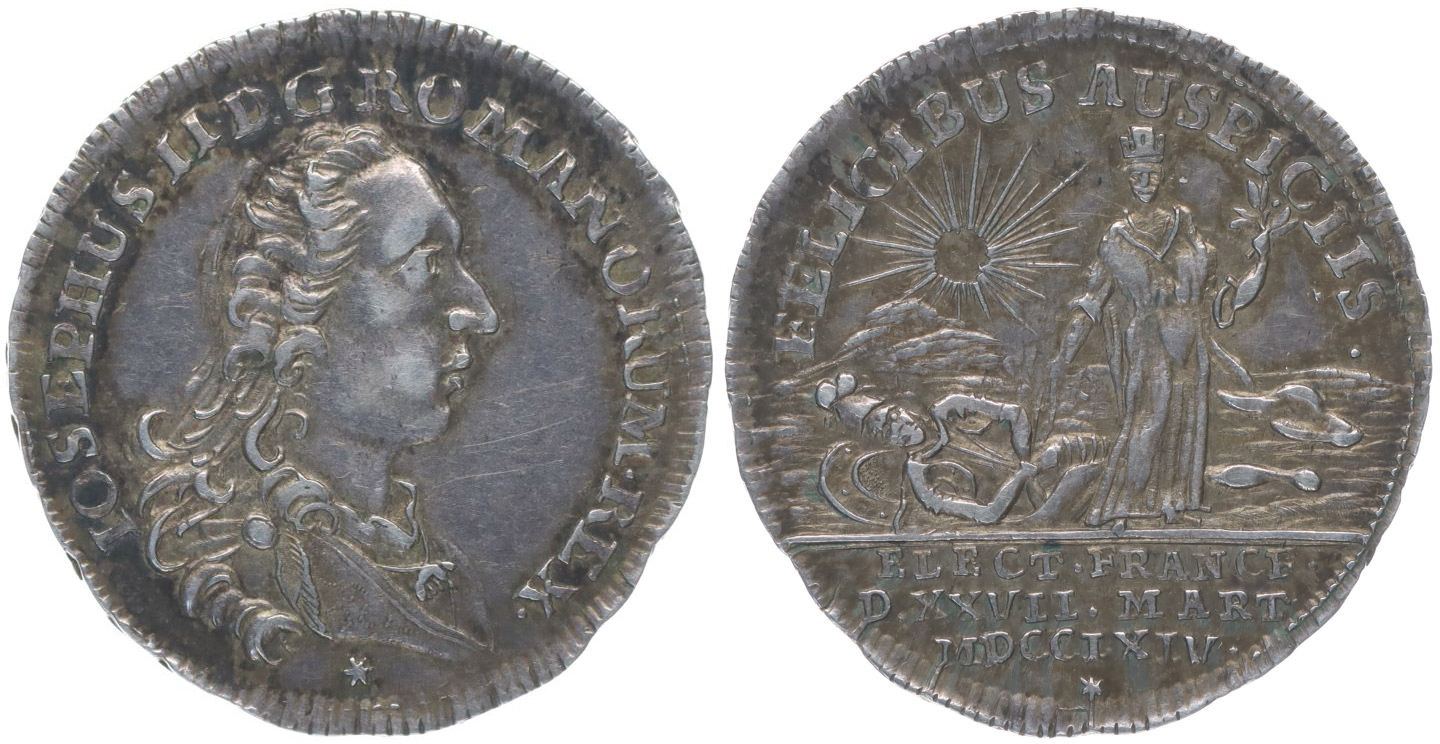 Menší peníz na volbu ve Frankfurtu, 27.3.1764 Portrét císaře zprava, opis / patronka města nad spoutaným válečníkem, opis, nápis v úseči, Ag 22 mm, 2.173 g, JF.842b, Nov.XV/B-9b_R!