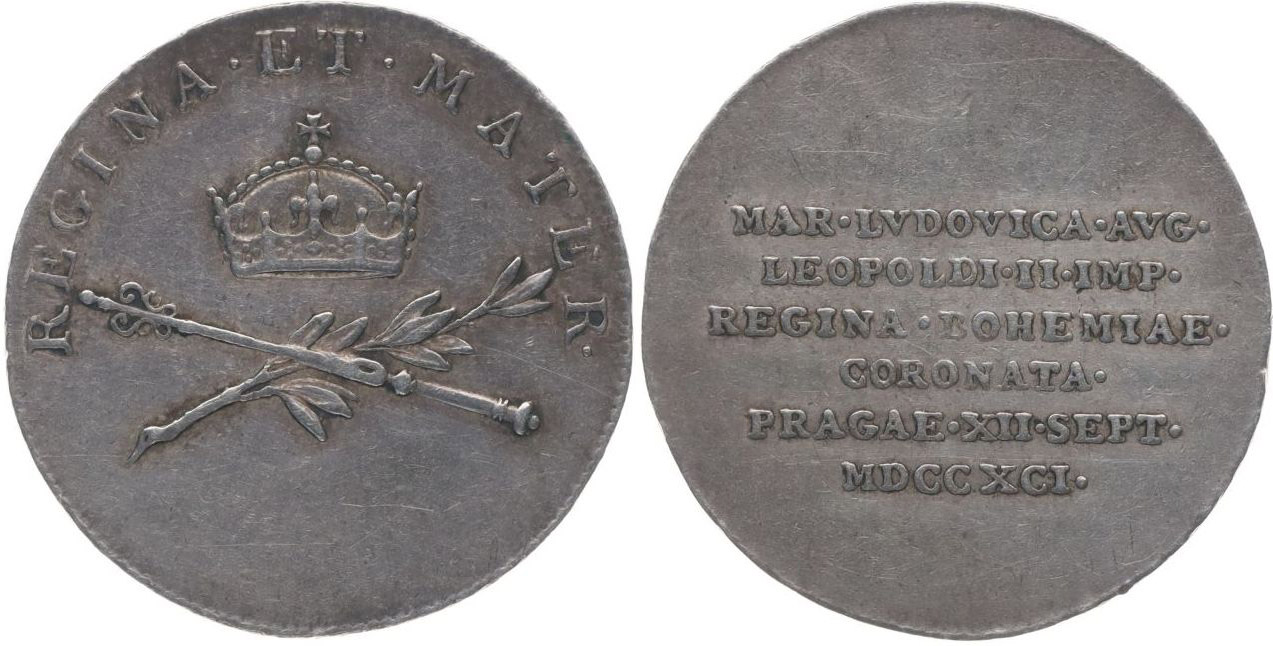 Menší peníz na korunovaci v Praze, 6.IX.1791 Koruna, nápis / stojící lev, znak a Svatoondřejský kříž, opis, Ag 21 mm, 2.19 g, Nov.XVI/Q-4b, ČS.1433, Don.3053, Mo.2242