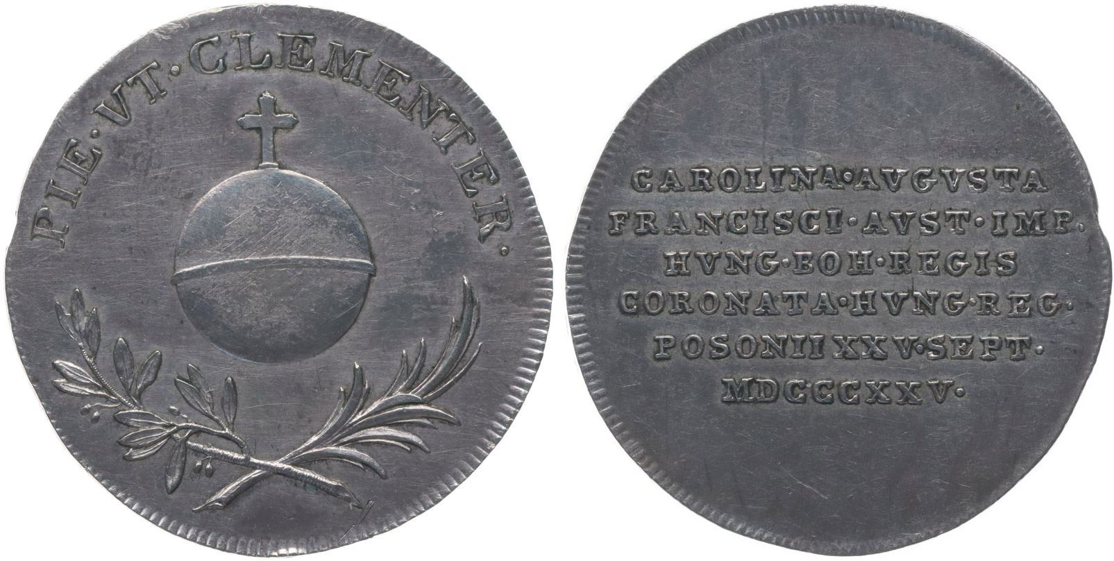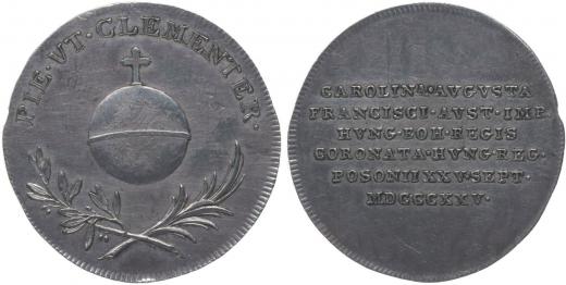 Větší peníz na korunovaci v Bratislavě, 25.9.1825 Říšské jablko, vavřínová a palmová snítka, opis / 6řádk.nápis Nesign., Ag 25 mm, 4.38 g, Nov.XVII/V-1b, Mo.2499, Ho.3472