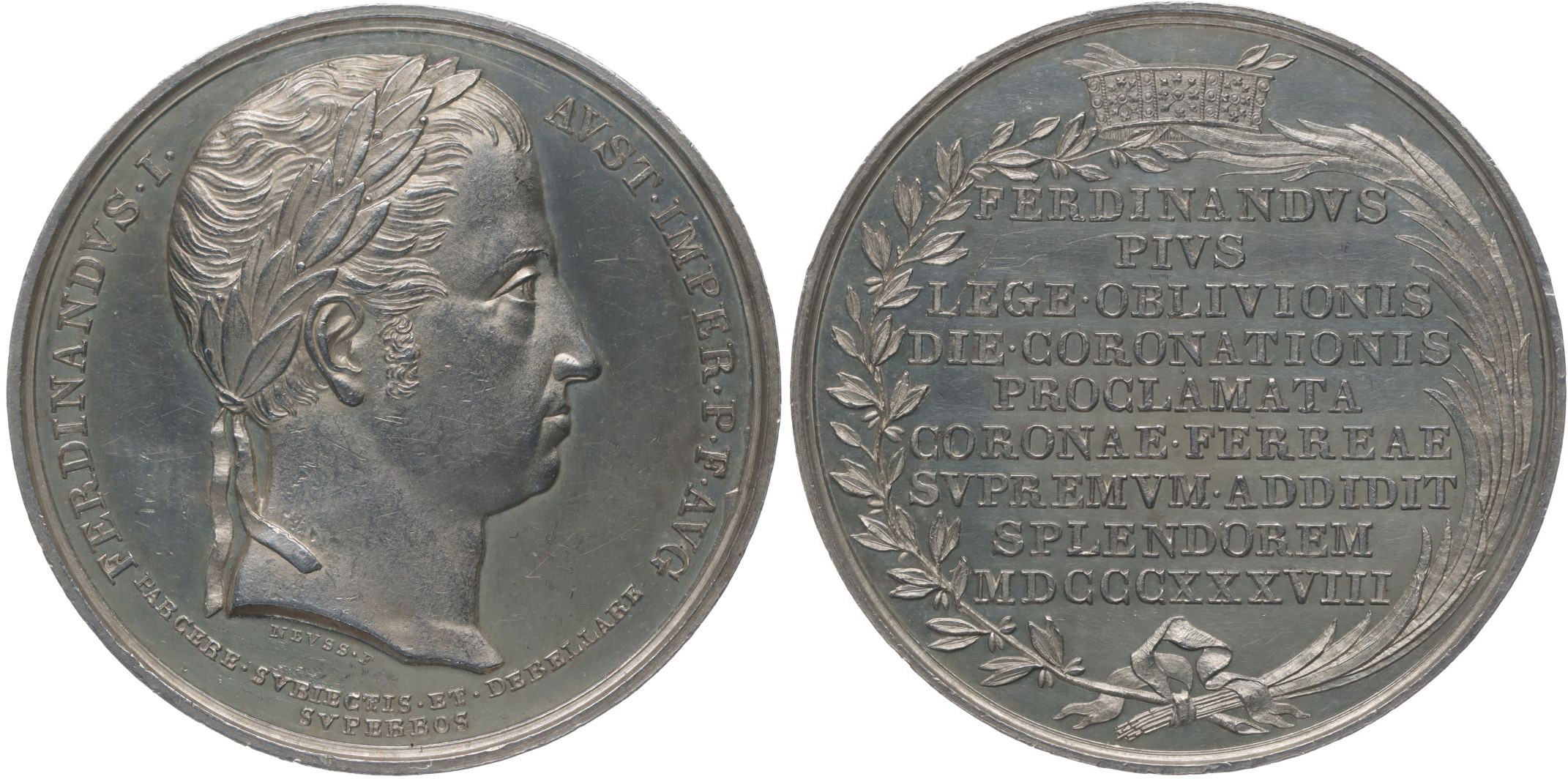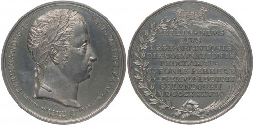 Neuss - medaile na korunovaci v Miláně 6.9.1838 Portrét zprava, opis / 9řádk.nápis ve věnci pod korunou Ag 33 mm, 13,58 g, Mo.2583, Nov.XVIII/G-5a, Ho.3638